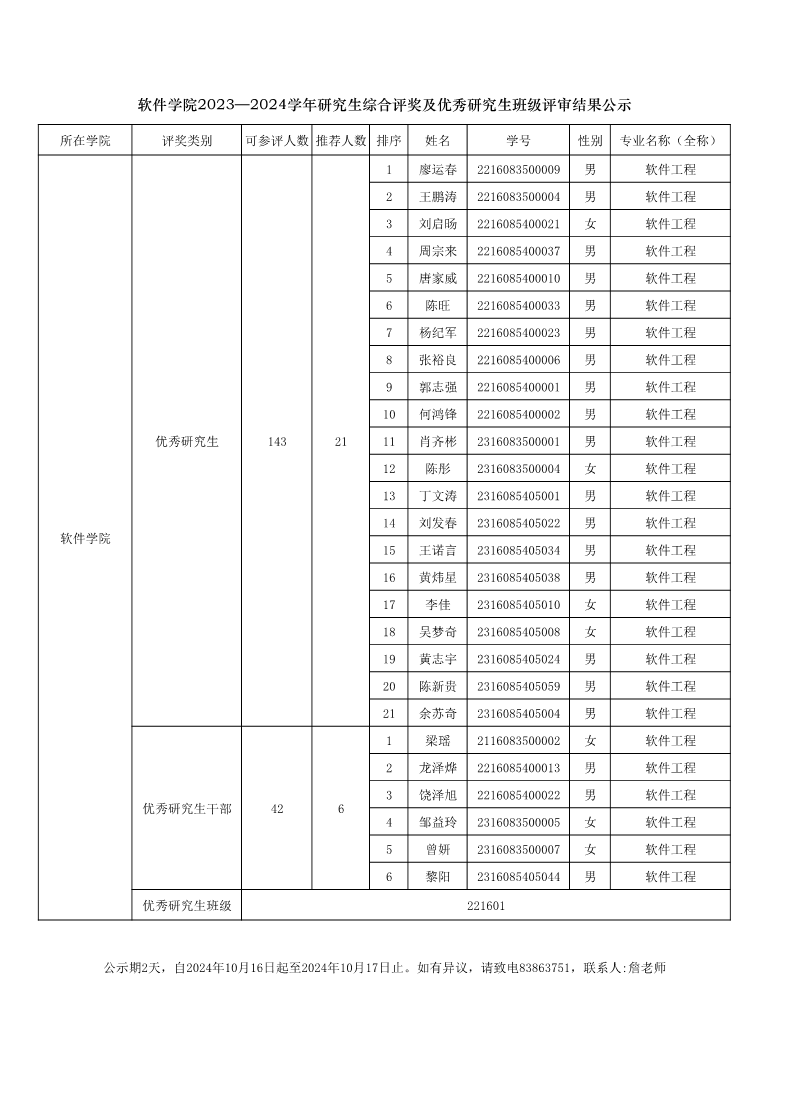 软件学院2023—2024学年研究生综合评奖及优秀研究生班级评审结果公示